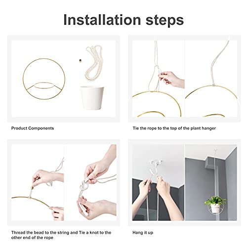 Materiaal: metalen beugel, katoenen touw en kunststof plantenpotten. Sterk en duurzaam. Geschikt voor binnen en buiten. De gouden ring in cirkelvorm past bij de ronde bloempot, om ramen, bed, deken, woonkamer, slaapkamer en keuken in je huis te verlichten.