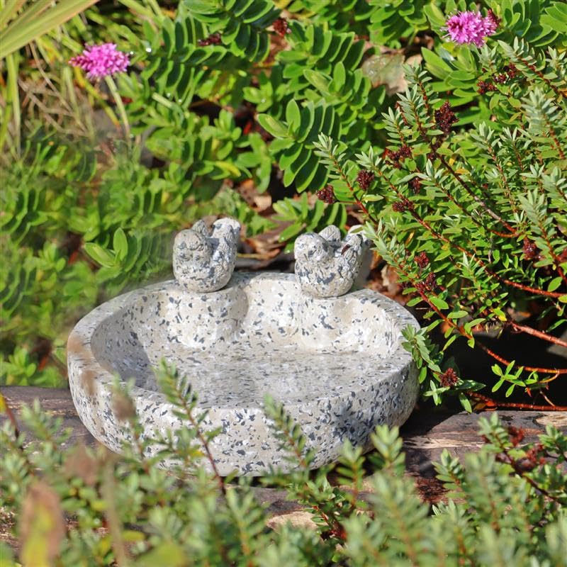 Aantrekkelijke kleine gevlekte vogelbad gemaakt van beton, met twee decoratieve vogels.