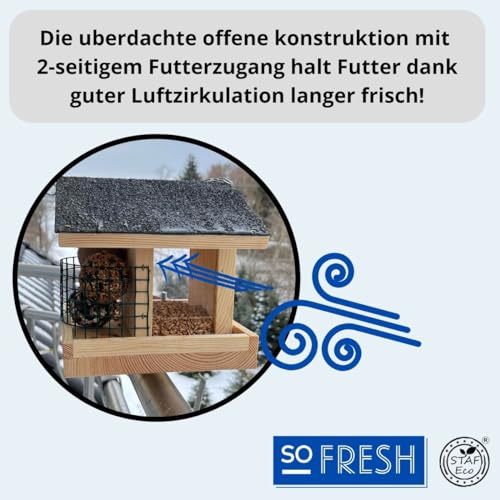 Het vogelvoederhuis is volledig gemaakt van natuurlijk hout – dus absoluut weerbestendig en extreem duurzaam.